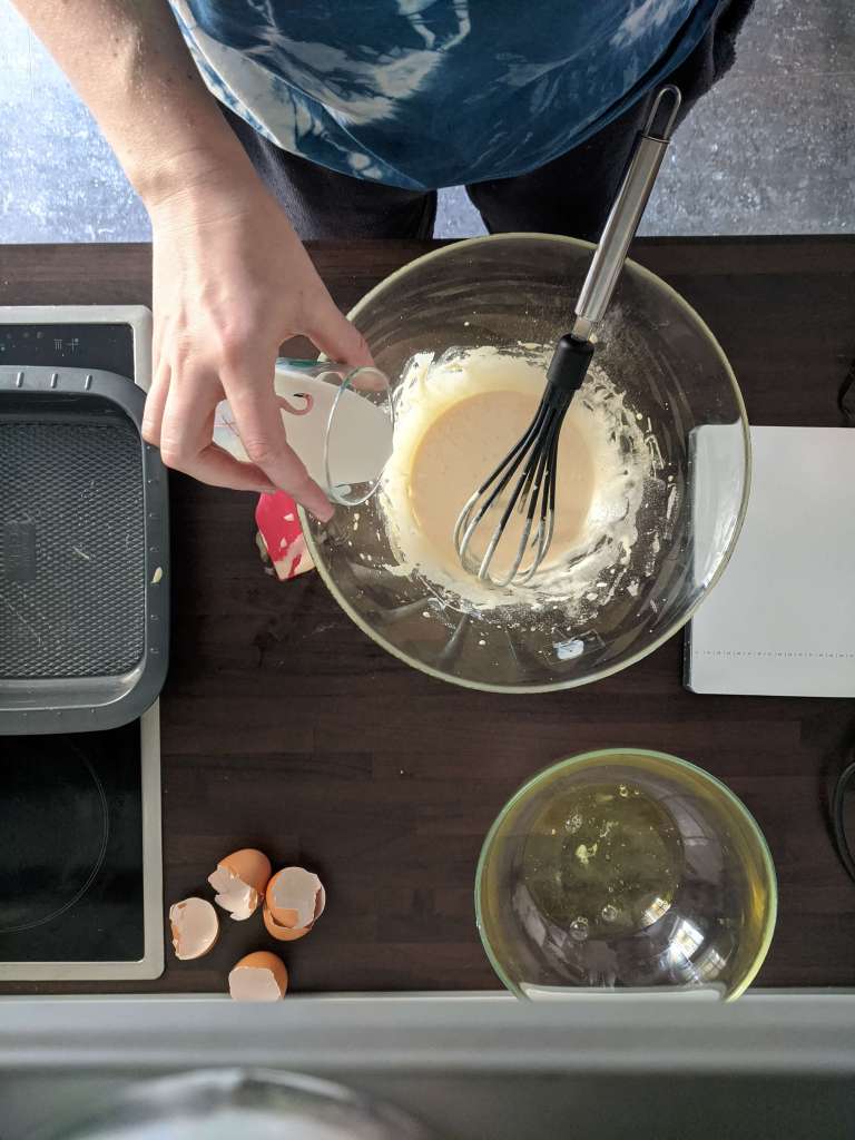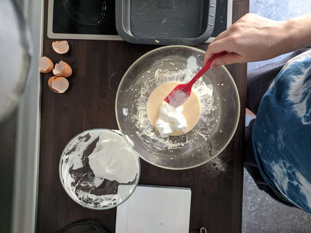 With clean beaters, whisk the egg whites until fluffy – around 1 minute. Then, whilst still beating the egg whites, gradually add 30g sugar. After a couple of minutes it should form medium stiff peaks which stay put when you pull your whisk upwards. Gently fold the egg whites into the yolks, reuniting the eggs in their new forms.