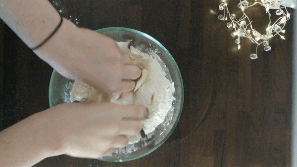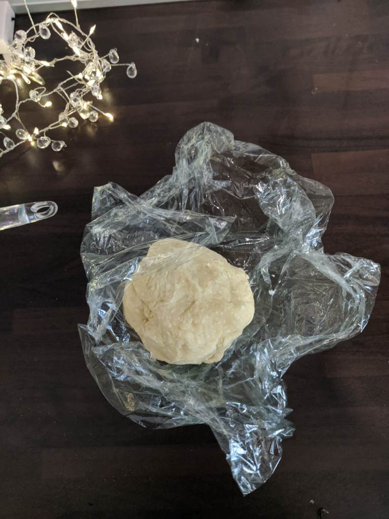 Then add some icey cold water, 20ml to start with, and then a little more until the dough comes together. It should be soft and a little rubbery. Pat down into a rough rectangle and wrap in cling film.