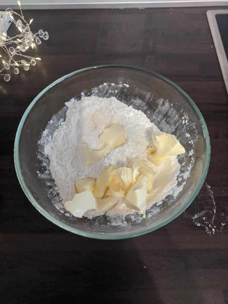 First, make sure your butter is having a time out in the fridge, cooling off before it meets the flour. Weigh out 155g flour. Add 1/2tsp salt and 1.5tsp sugar. Mix the dry goods together with a spoon. Remove the chilled butter from the fridge. Cut 115g into smaller cubes. Add to the flour.