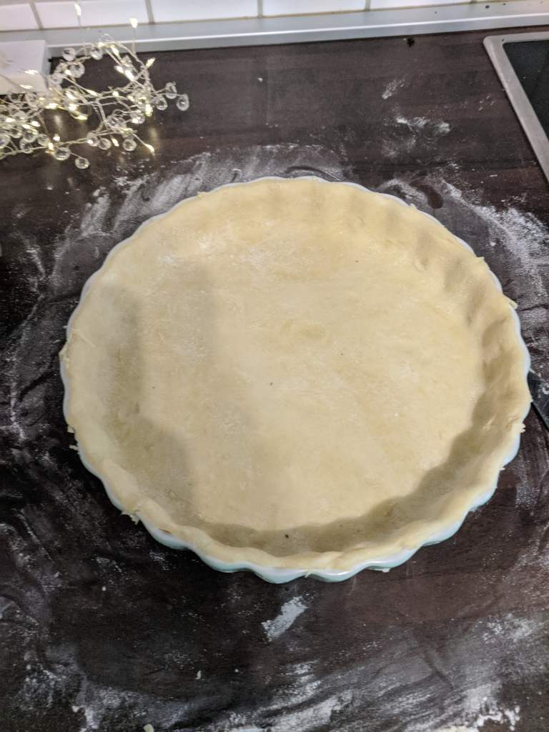 Bring the pastry back out to normal climes. Sprinkle your work surface with a little flour and roll the pastry out until it fits into your pie dish.