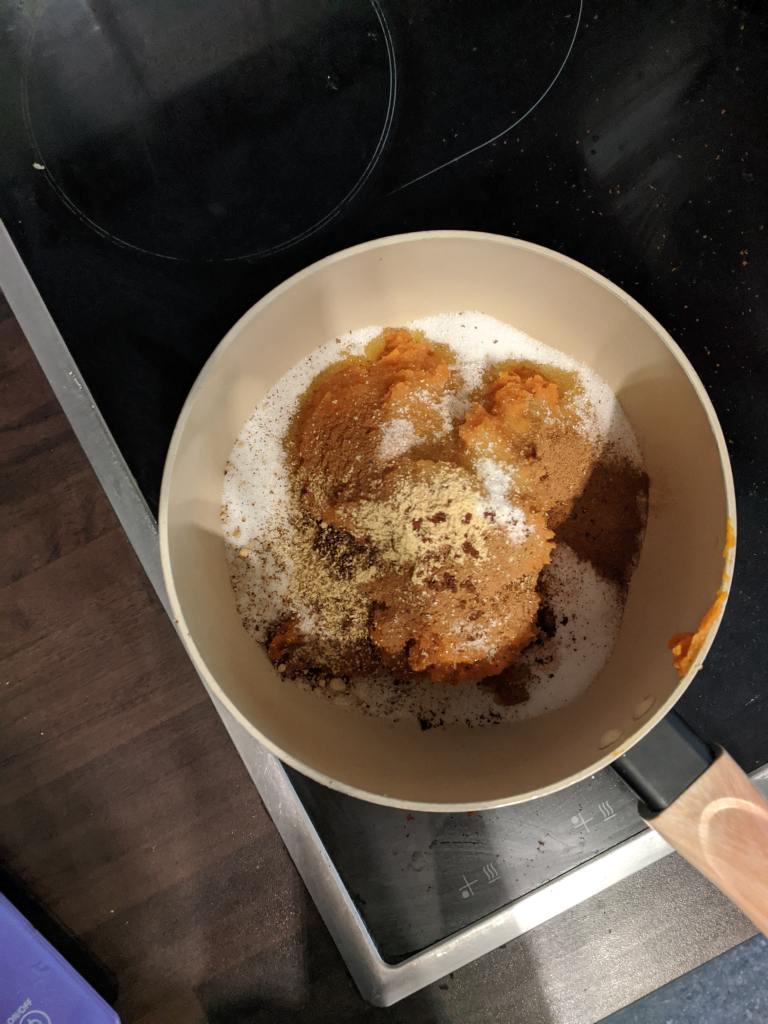 In a pot combine your pumpkin puree with 130g granulated sugar, 1/2tsp salt, 1tsp cinnamon,1/2tsp ginger, 1/8tsp cloves and1/8tsp nutmeg.