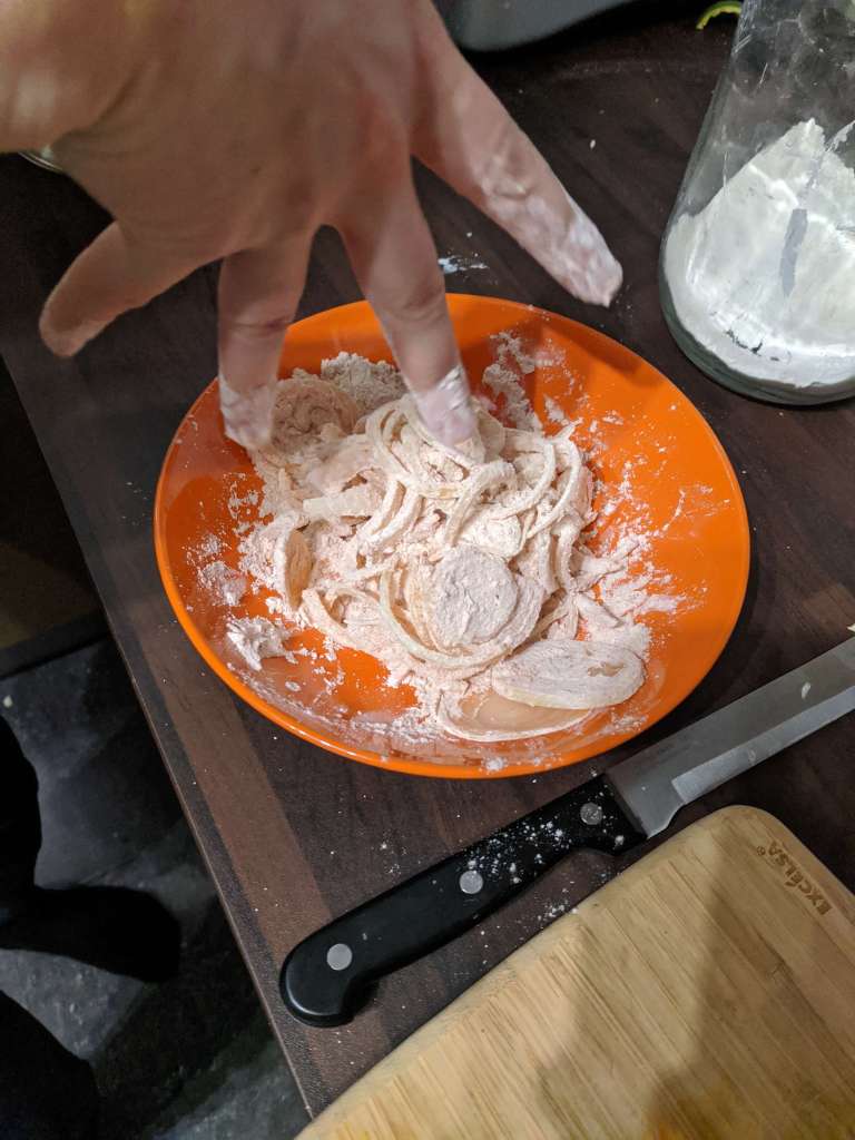 You want to cut your onion in half breadth ways and then slice it into to thin circles. In a bowl mix 20g flour and 1 tsp paprika. Toss the onion in the flourika mix. Make sure they’re all nice and coated.