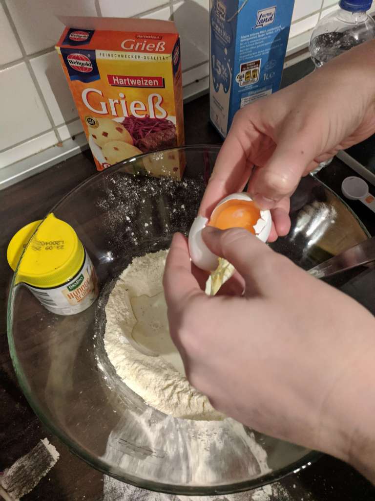Set some water to boiling on the hob, in a largeish saucepan. Whilst it heats up, get going on the spaetzle dough. In a large bowl, 120g of both flours, 3 eggs, 75ml milk, 40ml sparkling water, a pinch of pepper, nutmeg and salt.