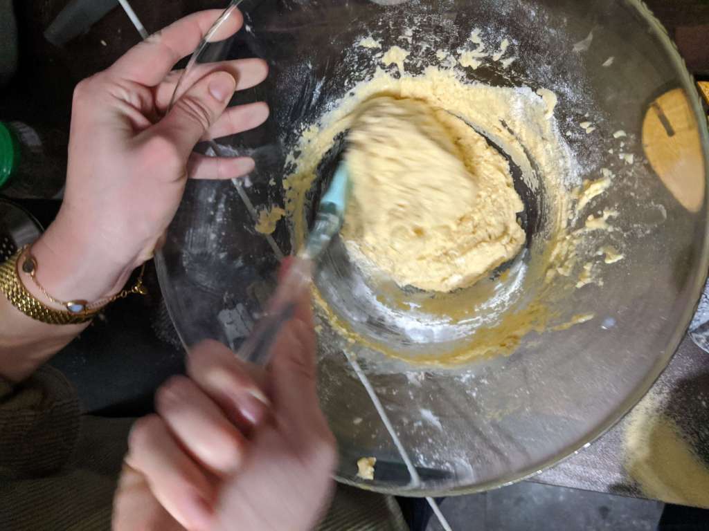 Use a whisk to get the mixture going, stir all the ingredients together. Once it has thinned out, you can start to mix it with a spatula. The end result should be elastic, not runny, but also not too thick.