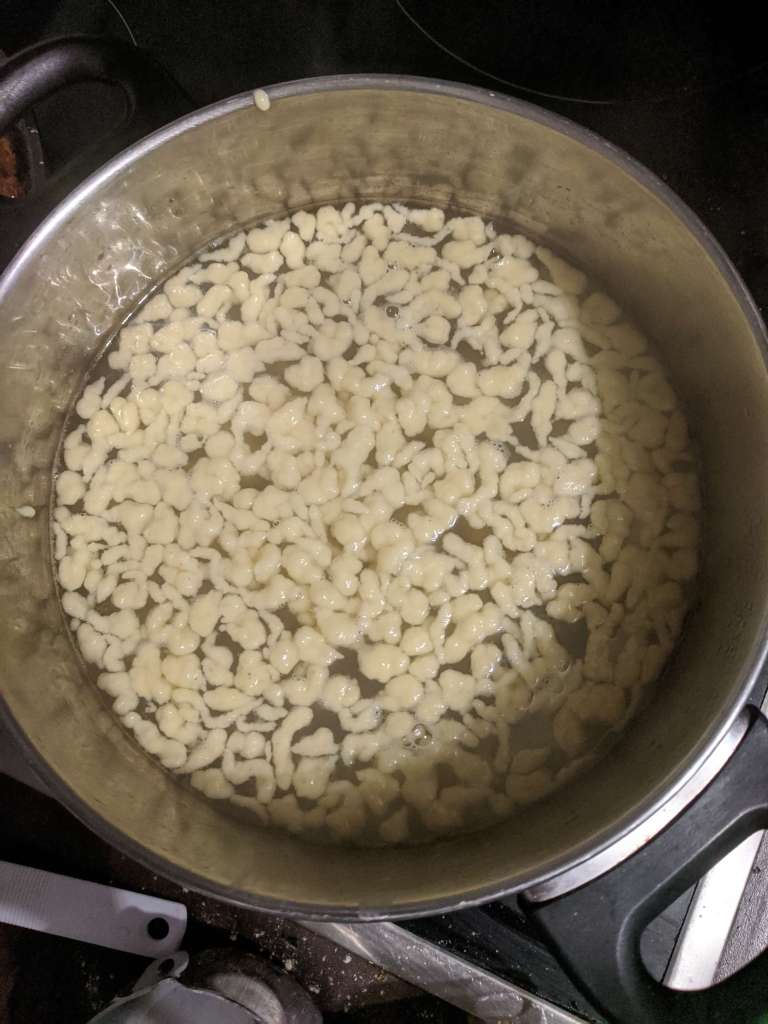 Once in, the little tadpole like Spaetzle will take two minutes to cook.