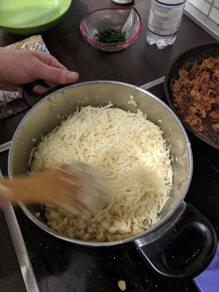In the same pot, or a cast iron skillet if you want to serve this fancy Alpine style, warm the 60ml chicken stock. Then, add the Spaetzle back in, give the pan a shimmy to mix it with the stock. Reheat the Spaetzle and then add the grated cheese.