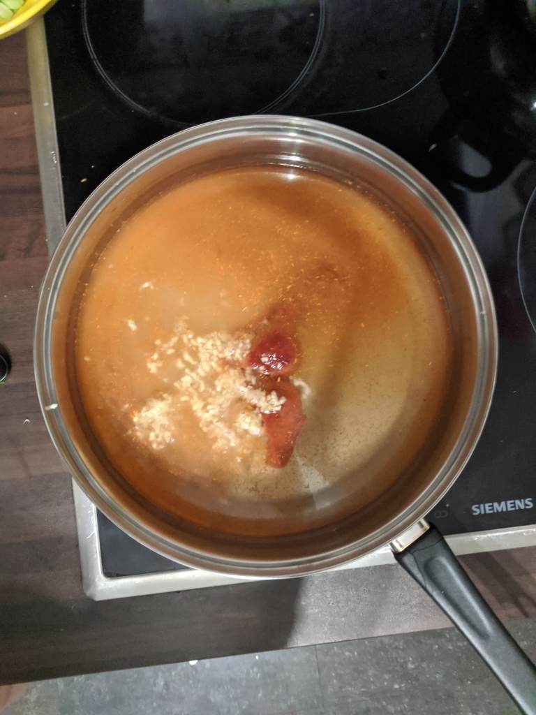 Add the 3tbsp gochujang, 1-3 tsp chilli flakes to taste, 1tbsp sugar, 1tbsp soy sauce and your tbsp minced garlic. Turn the heat to medium high and give it a mixy mix until all combined.