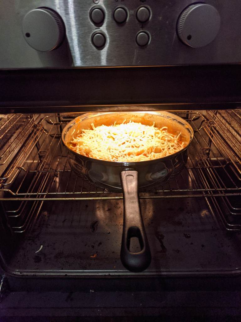 Then add your mozzarella. It will melt on the hob, but if you have a grill, whack it under on a high heat to get it nice and pizza melty.