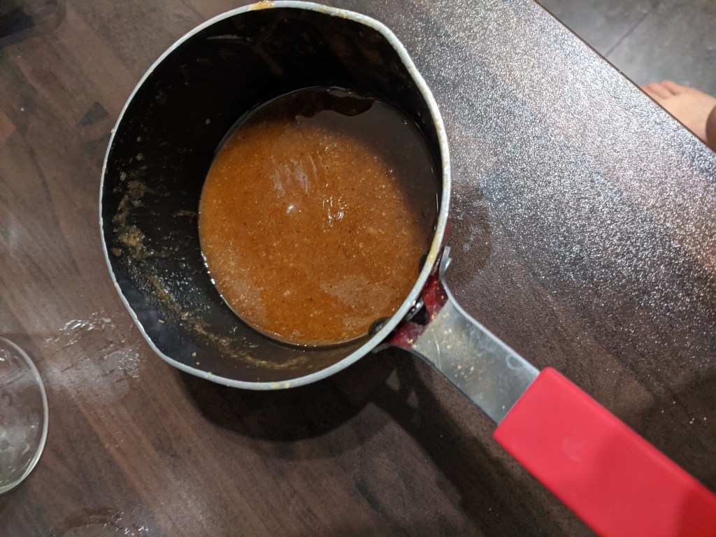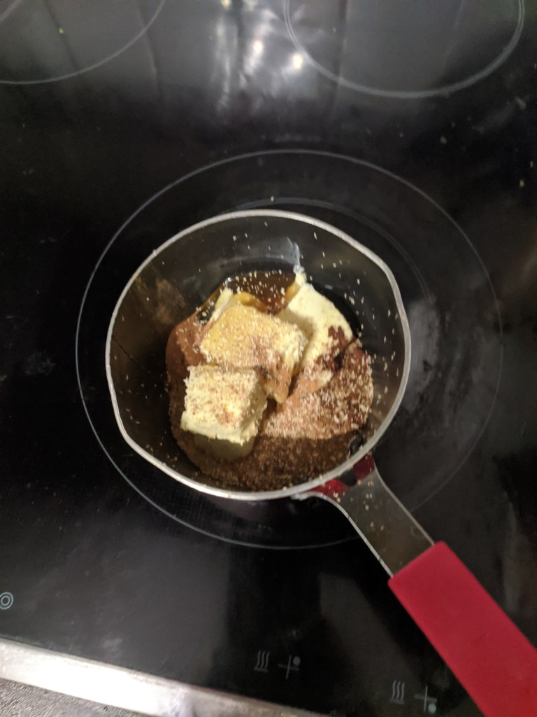 Like a Christmas tree, this recipe needs a base to make it strong and pleasing. Start by melting 135g brown sugar, 55g butter, 40g honey, with those quintessential Christmas spices, 1/2tsp cinnamon, 1/4tsp nutmeg, a pinch of ground cloves and a pinch of salt over a medium heat on the hob.