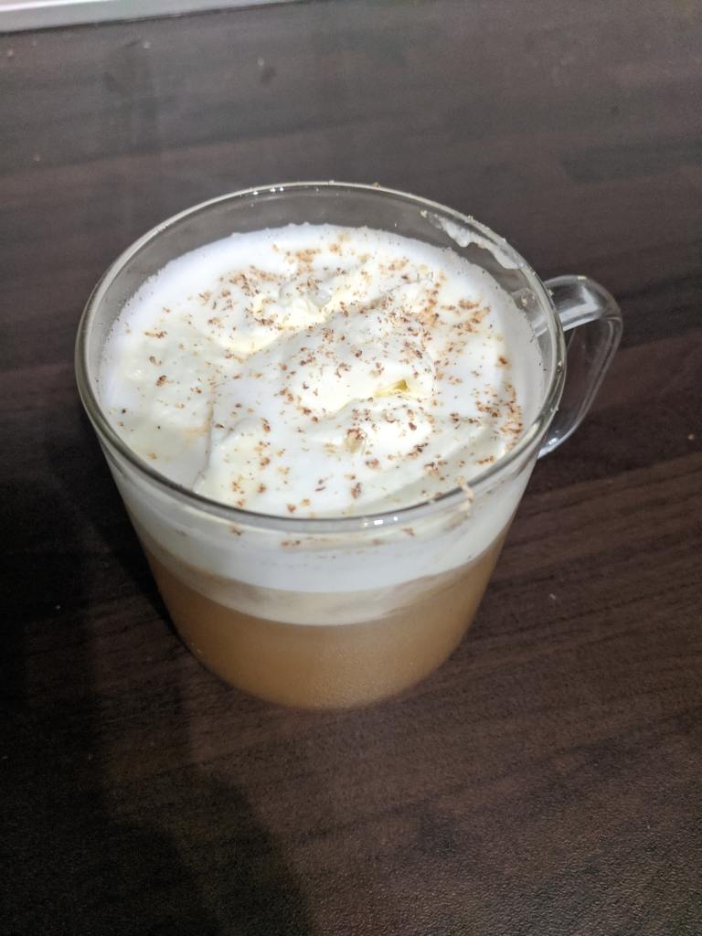 Top with whipped cream, 2 tbsp should do the trick- but the more the merrier, and a sprinkle of ground nutmeg.