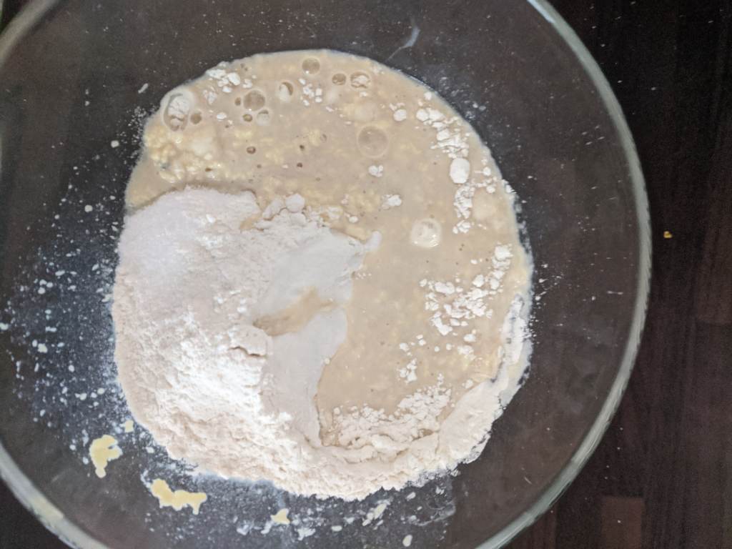 In a large bowl mix 560g plain flour, 2tsp of cardamon (or more, trust your nose on this one, it should be palpably cardomony), 25g sugar and 1 tsp salt. Pour in the yeasty, milky mixture and bring together with your hands.