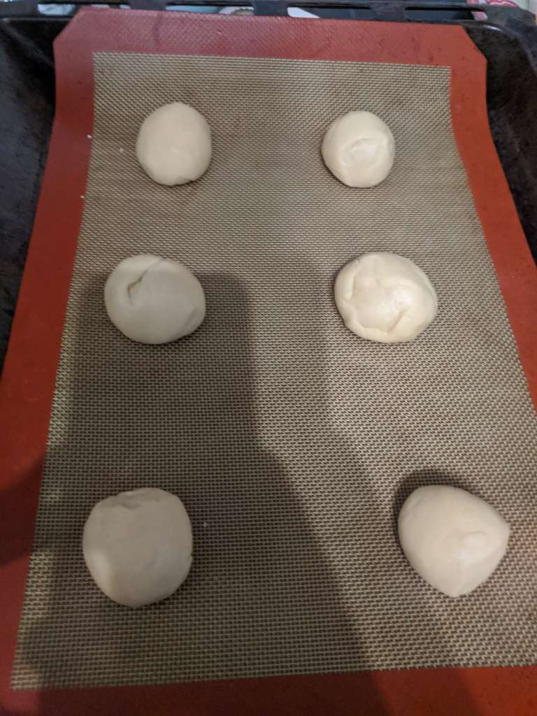 After 2 hours return to your inflated dough. Show it who’s in charge with some tender punches. Leave it for five minutes. Then shape it into 18 little circles. You can weigh them to make them all equal, but doing it by eye and having some variety is also good. Place the finished balls on a greased tray, making sure to keep a few inches a part.