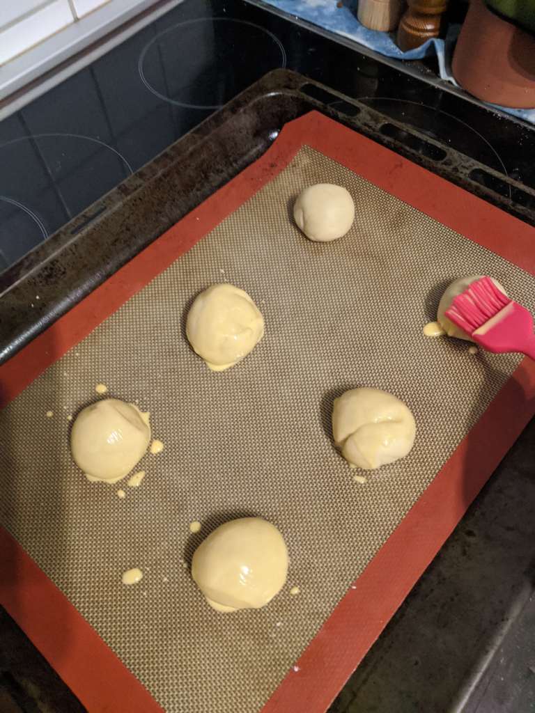 Once risen, and doubled in size, take the buns out of the oven. Heat it to 175°c. Mix the left over egg yolk with 1 tbsp cream. Brush each bun gently with the vegan nightmare of an egg wash.