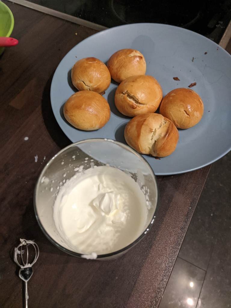 While the buns are cooling you can whip up your 450ml double cream until it took looks like something your grandma would be proud to put in her Victoria sponge.