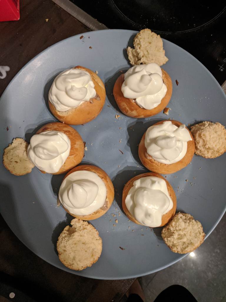 Lizzy says: “I remember eating my first semla bun in Stockholm in a intimidatingly trendy cafe (where I embarrassingly managed to spill coffee all over myself) and I loved them. Making recipes that you’ve had before, but made by professionals, is always fun. It’s also really empowering realising how accessible a lot of the fancier recipes are. These semlor were not too tricky to make. I added a lot more cardamom than was suggested, which I would 100p recommend because otherwise it doesn’t come through. It was really interesting making the marzipan, although it wasn’t nearly almondy enough (which boathed well because I am not a fan of marzipan). The cream also would have benefitted from a little bit of sugar popped in – but cooking is always a learning experience. In general, I really enjoyed them and was glad to eat them at home so no one was around to judge when I emerged from each bite with a face covered with cream. 8/10“