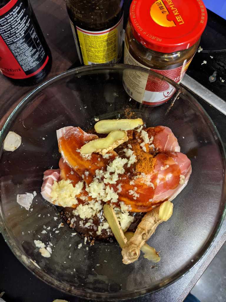 Preheat your oven to 200°c. While your oven is heating, deliberate (RuPaul style) over which pan you’re going to use to cook the pork. The ideal is a wire rack which will fit inside a deep, larger tray. If you have this, then you go glen coco, fill the tray with hot water and place the marinated meat on top of the wire rack. This makes sure it stays nice and juicy tender (insert clip of Gollum doing a jig).