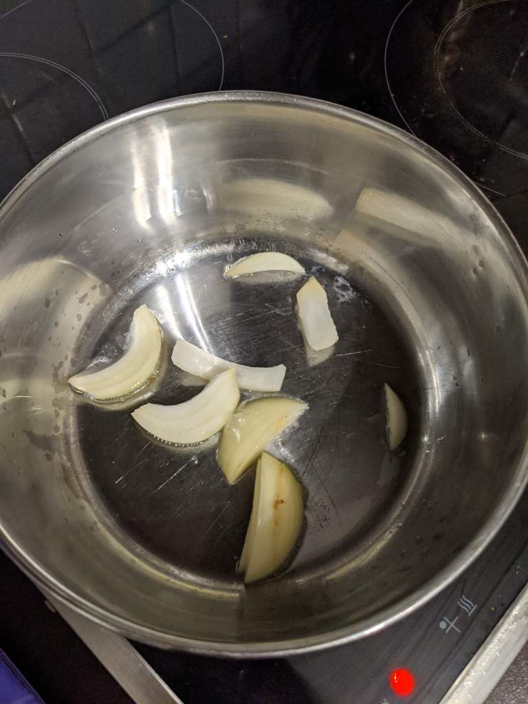 First, add 1/2tbsp of neutral oil to a pan and heat on a medium heat. Slice half an onion whilst the oil is heating, then whimsically throw into the pan. You can have a monch on the other half an onion if you feel like you need to channel your inner Stanley Yelnats. Fry the onions until slightly golden.
