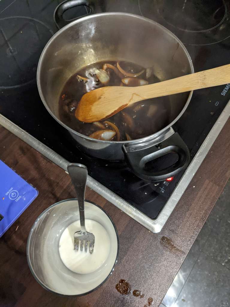 Turn the hob to the lowest heat and put the onionless gravy on the heat. Mix in the corn starch water mix. You might need a whisk, it has a will to become very clumpy. Keep stirring until it is thick like your nan’s gravy. Put to the side to cool.