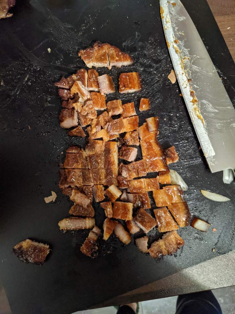 Return to the char siu pork and admire it’s golden radiance. Then get a knife and destroy what you love most. Chop one shoulder steak into small pieces, about the size of your pinky nail (but don’t chop yours up).