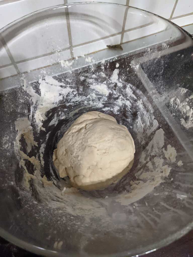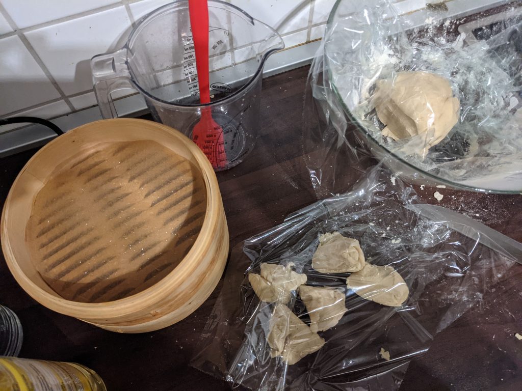 If you can find space amongst all your pending washing up, get started on the dough. In a bowl mix 350g plain flour, 2tbsp sugar, 2tsp baking powder and 2tsp dry yeast and 11/2 tbsp neutral oil. Mix with a spatula or chopsticks if you have them. Gradually add 180ml lukewarm water whilst mixing with your hand. You might not need all of the water, so go slowly. When it has formed into a rough dough pour it onto a surface and knead until smooth.