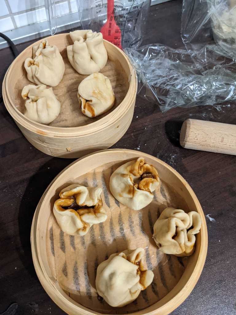 Take one wrapper at a time and fill with 1tbsp, or however much will fit in, of the char siu sauce. Pinch the edges of the wrapper to close the wrapper around the filling, red house spice has a great guide for the proper technique to this. Keep filling and pleating until all the bao are completed.