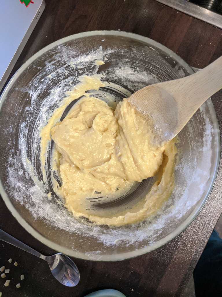Add the dry ingredients: 140g flour, 1 tsp baking powder, 38g bread crumbs, 48g ground almonds, 25g crushed almonds (we chopped up some almonds nice and small), 2tsp cardamom and 1/2 tsp vanilla sugar – or a dash of vanilla extract if you don’t have it. Use a spatula and lovingly fold in the dry ingredients.