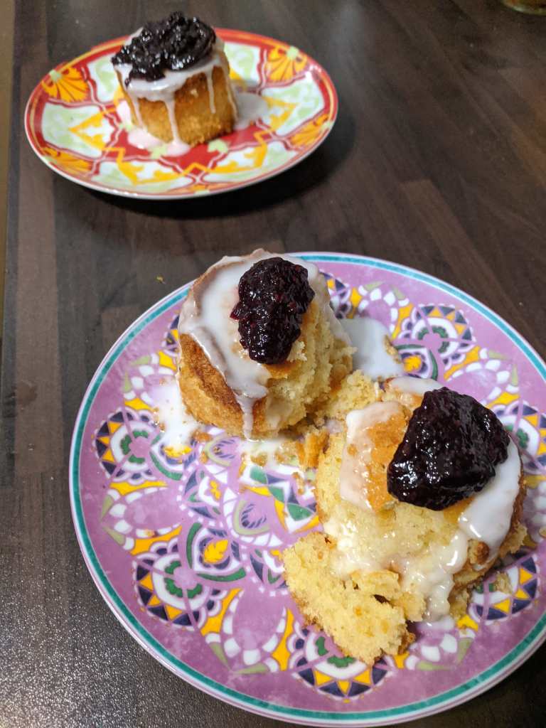 Kate says: “Considering how much of a disaster the process of making these cakes was, the outcome wasn’t half bad… Firstly – do not make them in tin cans, and if you still don’t heed my advice then be VERY gentle when taking them out after baking (a flaw I overlooked – cans have a smaller opening than their actual width…) . The cake itself is lovely and soft with a real punch of cardamom which is delicious. Although the jam and icing made it look beautiful and regal I wouldn’t be tempted to use them again – I liked the cake on its own. Also I added a cinnamon stick when making the syrup instead of using rum which worked well! 6/10 alright, but not my favourite bake we’ve made.”