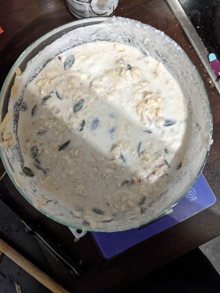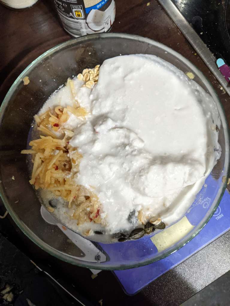 Stir together your 400ml tin of coconut milk, 200ml cold water, 100g rolled oats, grated thumb of ginger, roughly grated apple, 3 tbsp sunflower and a squeeze of lemon juice.