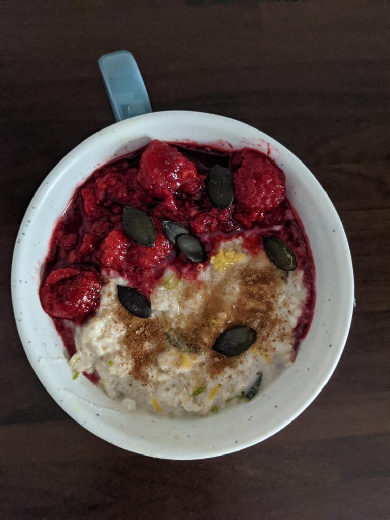 Serve it cold with some berries, dried fruit, nuts, seeds or yoghurt. Basically anything you want! It’s the froyo of breakfasts.