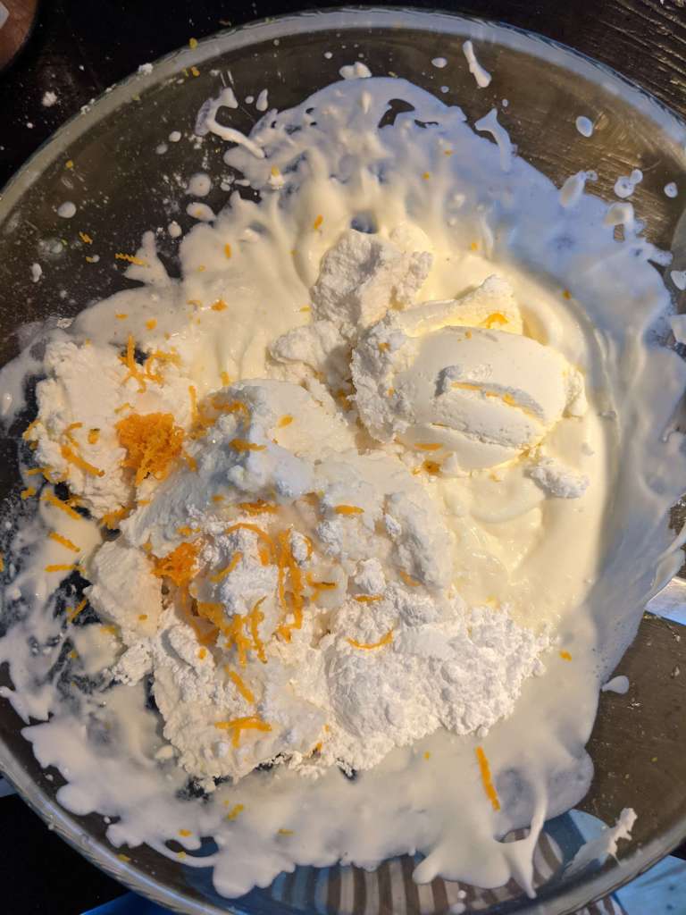 In another bowl, mix 58g mascarpone, the rest of the icing sugar, 16g, 1/2tsp vanilla extract, 1/2tsp orange zest and a pinch of salt. Mix only until combined. Time to bring back those peaks; gently fold the cream into the mascarpone. Refrigerate until your tubes are ready to be filled.