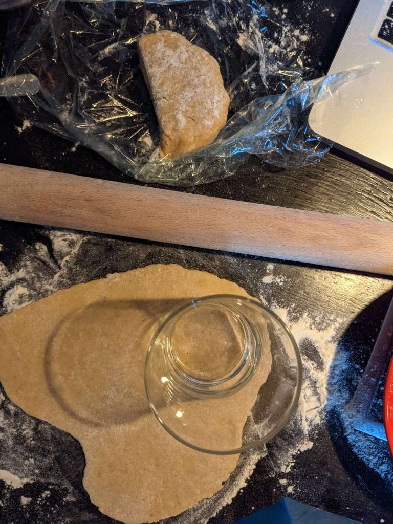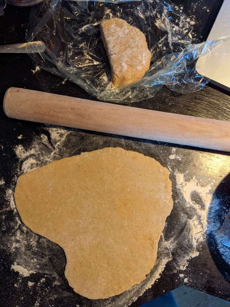 Once the dough has had its cooling off time on the naughty step of the fridge, take it out and roll out on a lightly floured surface until it’s half a centimeter thick.