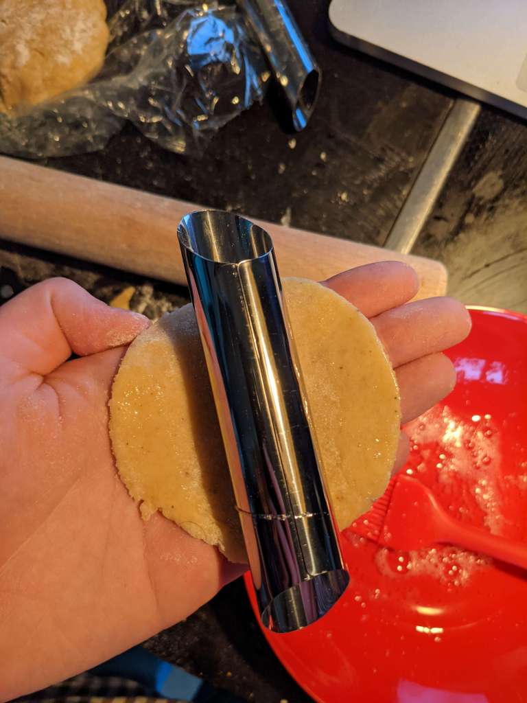 When all your circles are cut, you’re ready to play dough frisbee… only joking… Wrap each circle around a cannoli tube and stick the edges together with egg white.