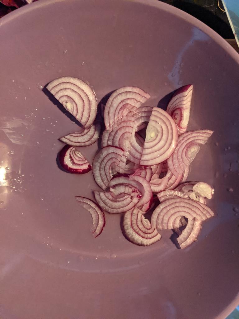 Back to the onion for a second, it should be bright pink and pickled. Add the 2.5tsp of olive oil, 1tsp of honey and grate in the 20g ginger (maybe less depending on how much of a ginger fan you are). Careful not to call the ginger, ginger (unless you are ginger) or you’ll have Tim Minchin after you.