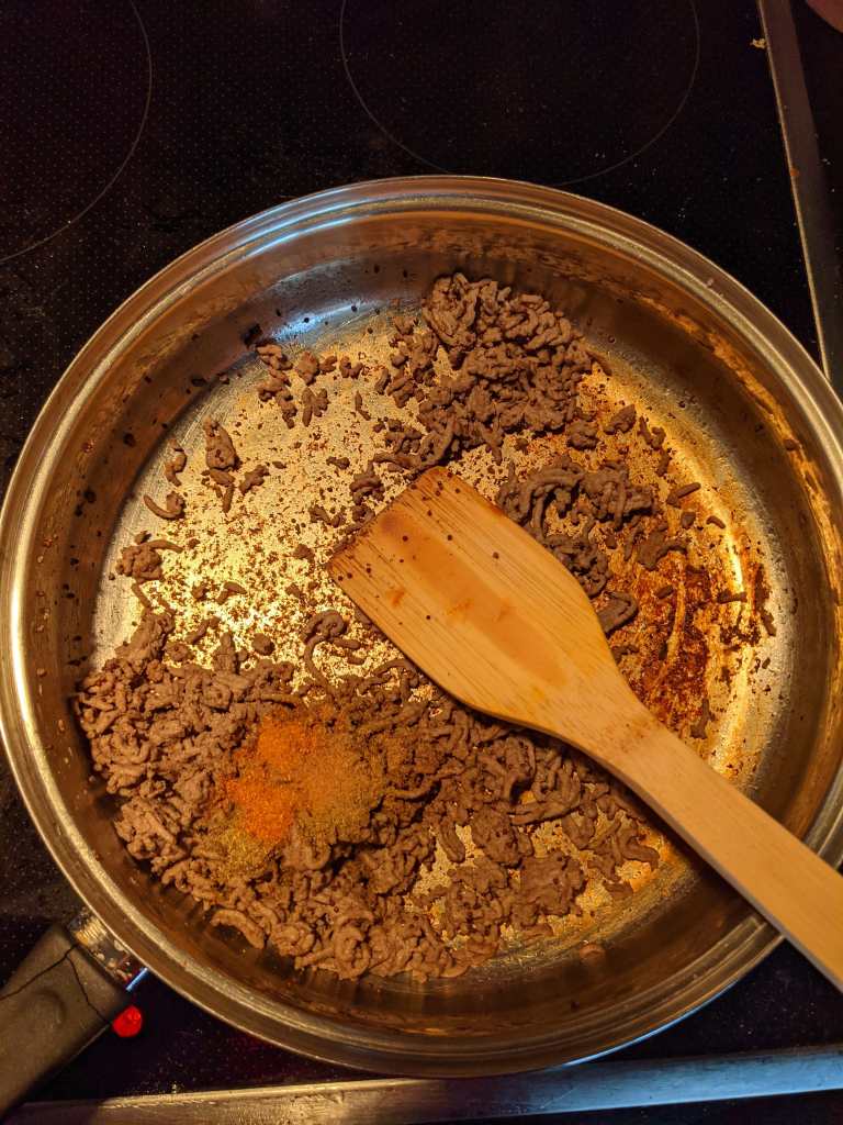 Meanwhile, in a galaxy not so far away, get your frying pan nice and hot and add in your 300g lamb (or meat alternative) and 1tsp mustard seeds to get the meat nice and crispy. Once it is browned and caramelised, turn the heat to low and add the 1.5 tsp ground cumin, 1tsp ground coriander, 1/4 tsp ground cinnamon, your preferred amount of chilli powder and a pinch of salt and stir it into the meat cooking for another couple of minutes. Turn off the heat – but leave the lamb where it is to keep warm.