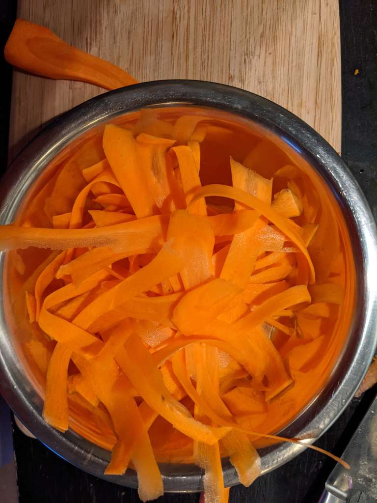 To make your salad start with the 4 carrots , cut off the ends and peel the skin. Then keep peeling ribbons off the carrots until you reach the core – save the cores for snacking and just in case you need to ask doc ‘eh what’s up?’