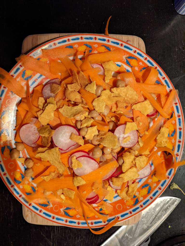 Add the carrot ribbons to a large bowl, along with two crushed poppadoms. Slice your 100g of radishes and drain and rinse your tin of chickpeas then invite them to the party and add them to the bowl. No need to be a harsh bouncer here, we know that radishes always make the party popping. Pick in some coriander leaves – but don’t add the stalks, or do if you want – you’re your own free agent!