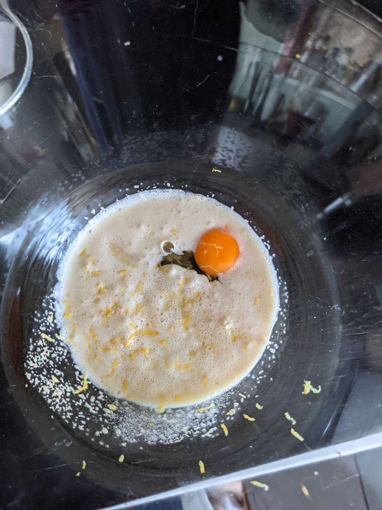 Once he’s had his 5 minutes on the naughty step it’s time to add the 2 eggs, 1/2 tbsp rum, 1/2 tsp vanilla extract, 1/2 tbsp lemon zest and whisk it together (with an electric whisk if you’ve got one).