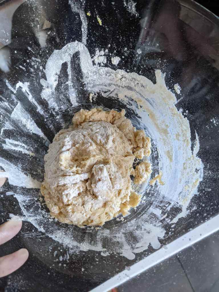 Add a third of the flour and continue whisking, then add the rest and the salt and knead it together until you get a rough dough.