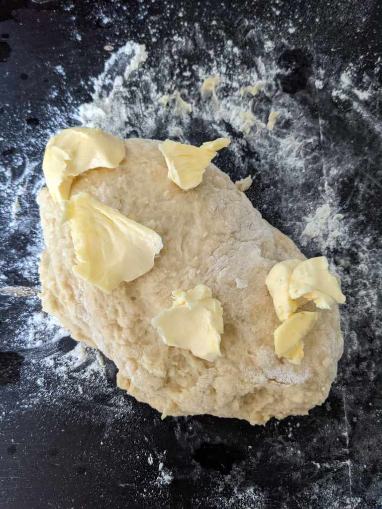 Turn the dough out onto a surface and add in your butter in small chunks and knead together for around ten minutes until you have a smooth dough (smoother than a baby’s bottom is the standard measure of smooth here!) Place it in a greased bowl and leave it to rise for one hour if it’s summer or one hour 45 if it’s winter.