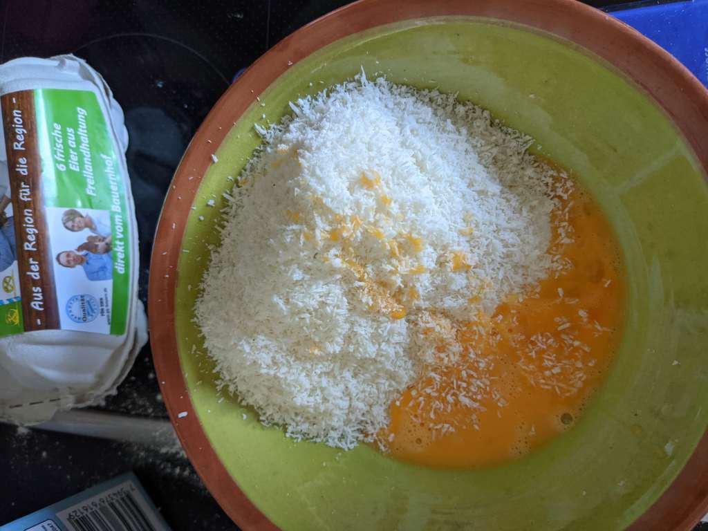 While the dough is resting, let’s make the coconut crust. Mix together 75g grated coconut, 56g sugar,1/2 egg. Admire the happy family on the egg carton and wonder if getting a chicken will also help you to repair your fractured family ties.