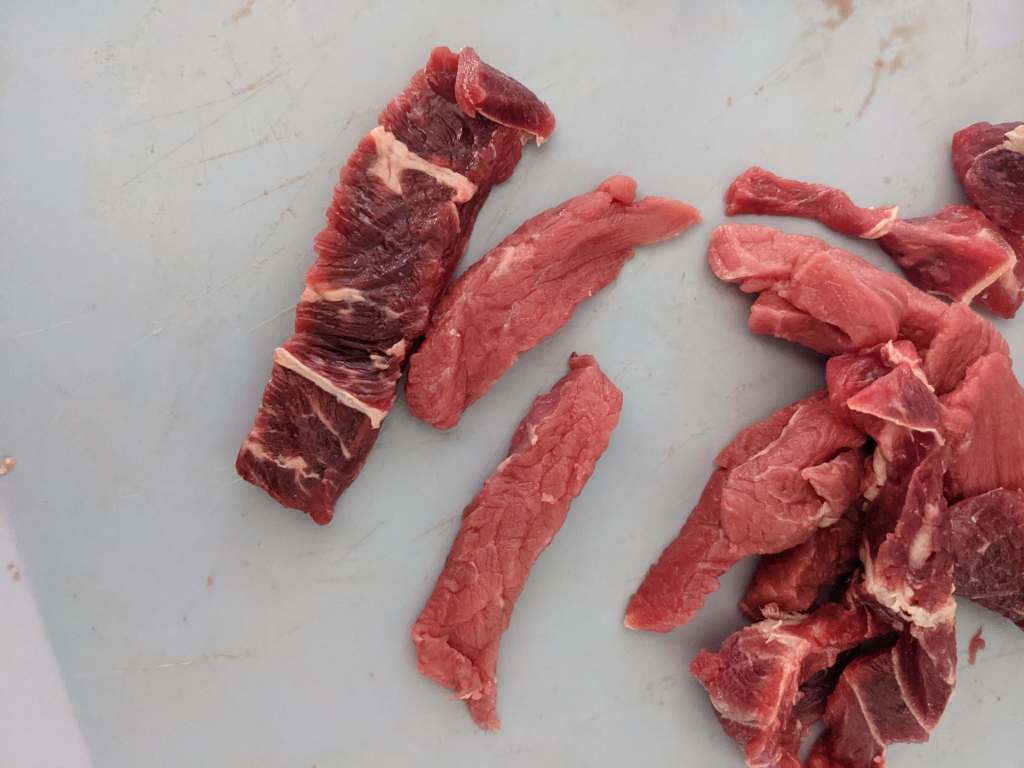 Slice your beef into strips of ~3-6cm and put them straight into the pot you’ll be slow cooking in. Any kind of beef will do (as Joseph once famously said) you’ll be slow cooking it for a while but beef with more fat will give more flavour.