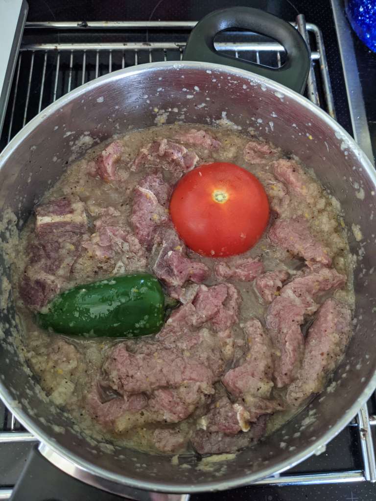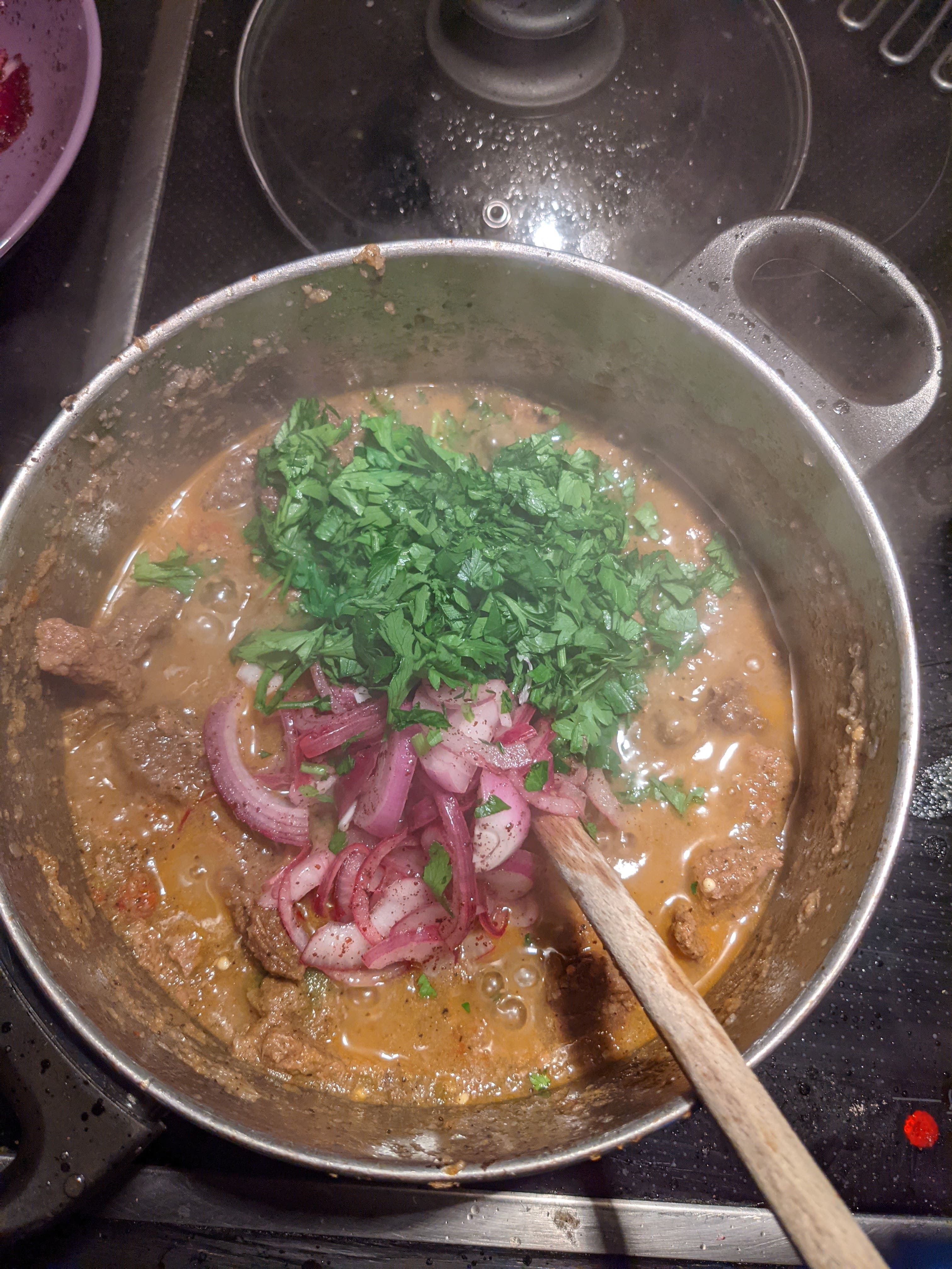 Once the marinading time is finally up, give the meat mixture a stir and put it on a high heat. Once it boils, add in the beef or lamb fat if you’ve got it and and turn the heat down to medium-low. Cover with a lid and let it cook down into a magical melty meat stew for about 1.5-2 hours.