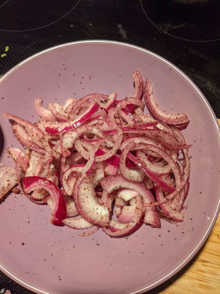 Slice the red onion thinly and mix with the salt and sumac, leave to sit for 10 minutes for all those wonderful flavours to mix together. Roughly chop the parsley and mix this and 1tbsp of lemon juice with the red onions. Ta-da! Like magic, your salad is done.