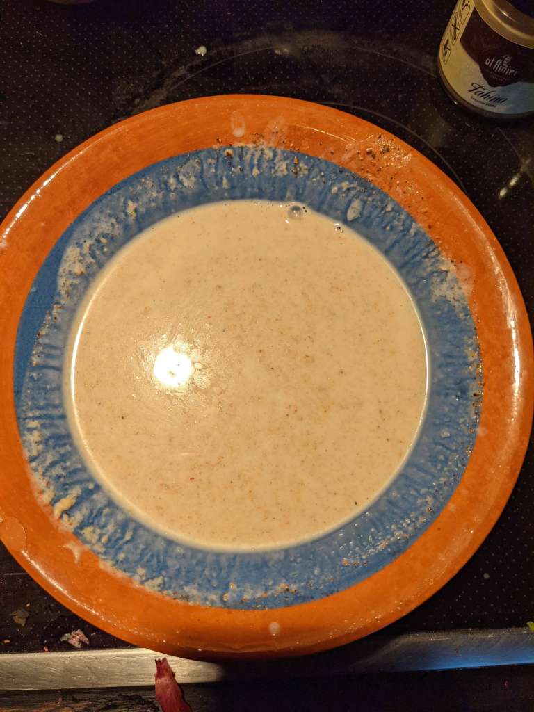 To make the tahini sauce, mix together 35g yoghurt, 25g tahini, 25ml water,1/2 tbsp lemon juice, pinch salt and pepper, a pinch of cumin and a pinch of chilli powder.
