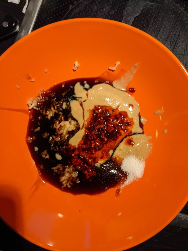 While your water is coming to the boil make your sauce. In a bowl mix 2tbsp sweet soy sauce, 2 finely diced cloves of garlic, 1tbsp sesame paste, 1-2tsp chilli oil depending on your tolerance to spice and 1/2tbsp sugar if you want ‘am sweet. Mixy mix and set to the side.