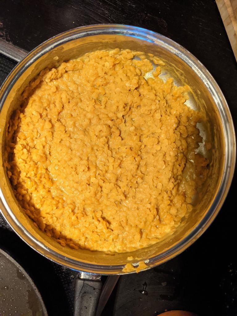 This part couldn’t be more simpdhal. Add 200g red lentils, 1/2 tsp turmeric, 1/2 tsp chilli powder, 1/2 tsp salt, 300ml water and your tin of coconut milk. Bring this to boil, not by shouting angry insults, but by cranking up the heat. Once boiling bring down to a simmer, not by calming it down with pleasantries, but by turning the heat down. Simmer for 20 minutes.