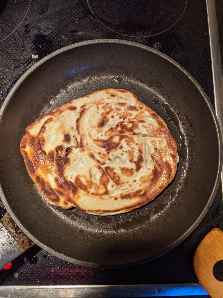 Slap a roti in the pan and cook for 2 minutes on each side. It should be crispy and charred.