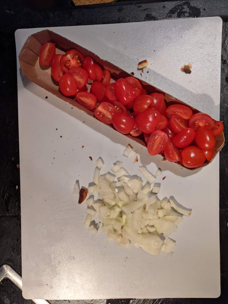 While your dhal is dhaling its thing, prepare your dhal topping. Cut your 125g tomatoes in half and chop up your small onion.