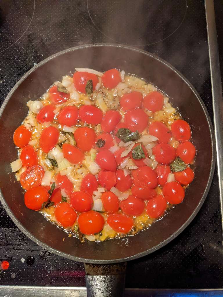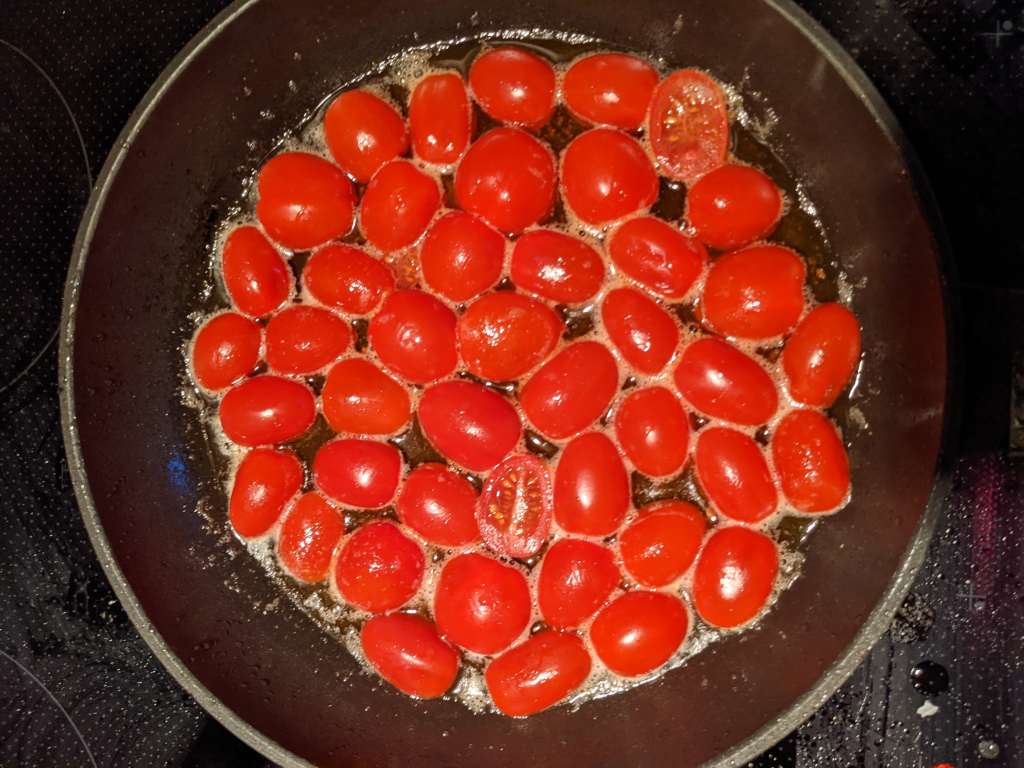 Heat 30g butter and 2tbsp butter in a pan, once melted place your tomatoes cut-side down into the pan. Careful not to get hot melted oil on yourself, an upside down tomato is not the end of the world! Leave to caramelize for a couple of minutes.