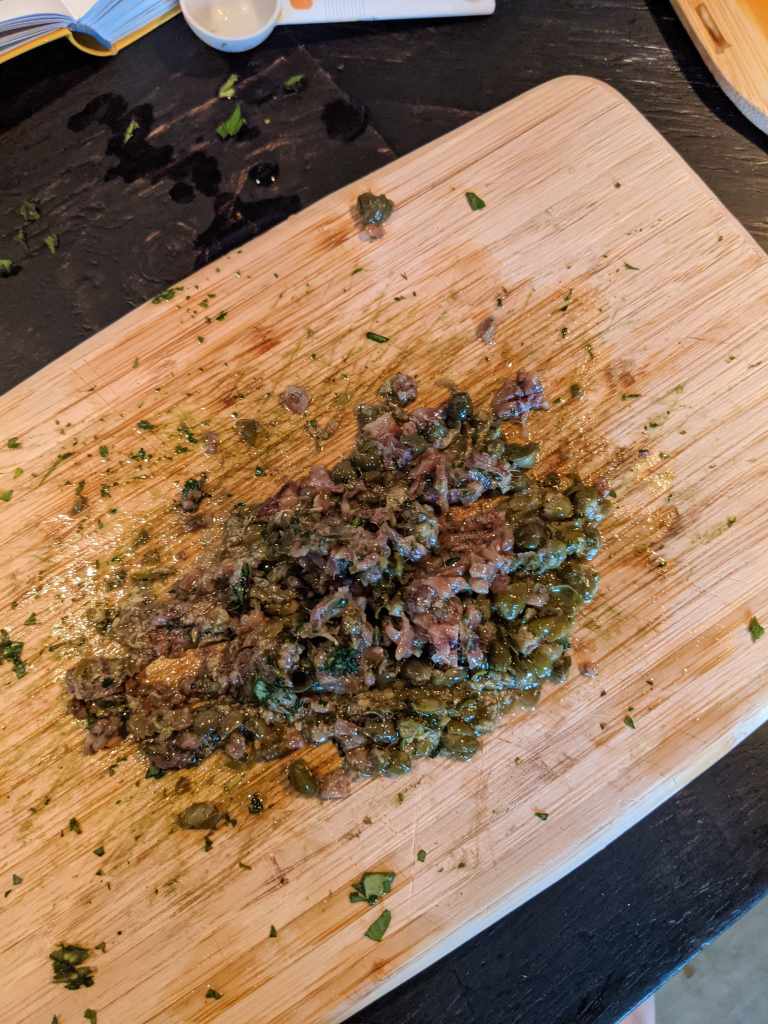Start your heavenly salad by preparing the salsa verde: finely chop 8g each of parsley, basil and mint (use a mezzaluna knife if you’re feeling cool like a she wolf), 1 garlic clove, 3/4tbsp of capers and 15g anchovies.